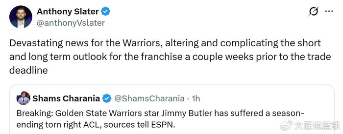 勇士队记Slater也跟进一针见血的指出,这对于勇士队是一个心碎的消息,也会让勇士队在交易截止日的短期与长期计划均发生复杂的改变。